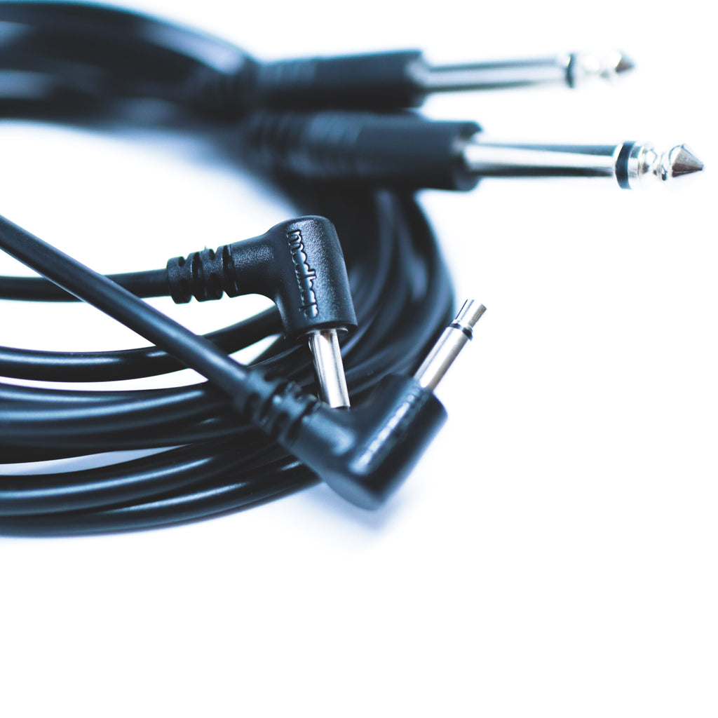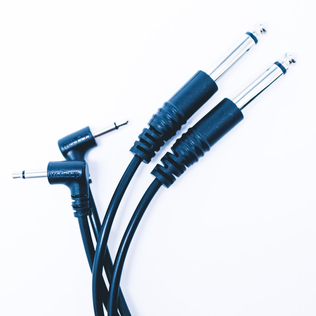 Our 1/4″ Straight to 1/8″ Right Angle Audio Patch Cables come in sets of 2 per package. Measuring in at 150cm (approx. 5 feet) long, these cables are made with the intention to eliminate the need for adapters when connecting your samplers, drum machines, and groove boxes to eurorack devices. Simply run the 1/4″ end from your groove box and the 3.5mm end directly into your eurorack modules that accept line-level signals. That’s it! No need for weird and hard-to-find (and keep up with) adapters. Just cop a set of our audio patch cables, connect and dig in.