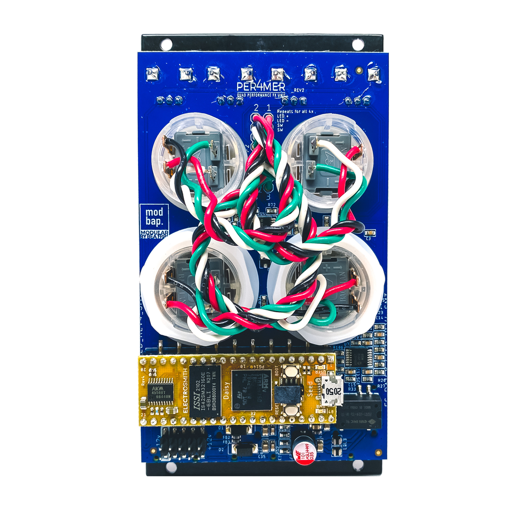 Per4mer is a 14hp eurorack formatted quad performance effects unit. Inspired by time-honored DJ effects processing boxes, Per4mer allows for a hands-on and CV / Gate controlled eurorack effects performance interaction. Whether momentarily engaging or latching FX, Per4mer offers an unrivaled and fun experience.