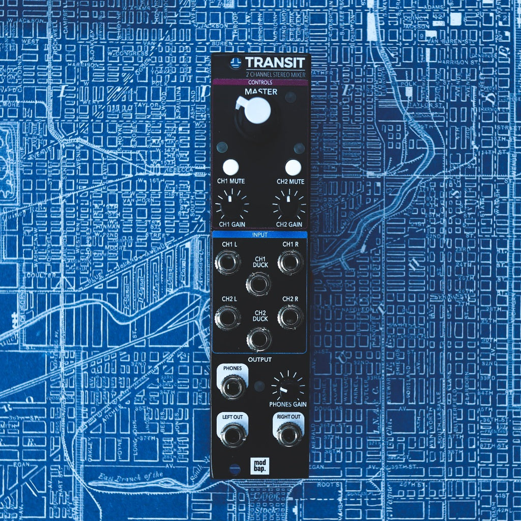 Transit pairs perfectly with Per4mer and a Modbap20 compact powered Eurorack case. It also pairs well with Osiris and any other module that could benefit from a compact analog dual channel stereo ducking mixer, sub mixer or final output mixer.