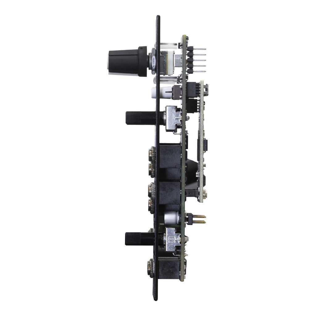 Transit has two stereo (dual mono) channel lanes of audio with an all-analog signal path. Each stereo channel lane has its own input gain control, mute button and ducking input. The Ducking input on each channel operates like traditional side-chaining on a compressor where an input signal, CV or Trigger input (i.e. LFO, Clock, Gate) modulates the gain reduction of the audio.